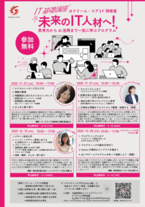 | イベント名 | (参加者募集) 大学生向けIT基礎講座「未来のIT人材へ!思考力からAI活用まで一気に学ぶプログラム」 |