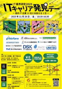 | イベント名 | (参加者募集) IT業界研究2025「ITキャリア発見デー~県内IT企業11社と出会える1日~」 |